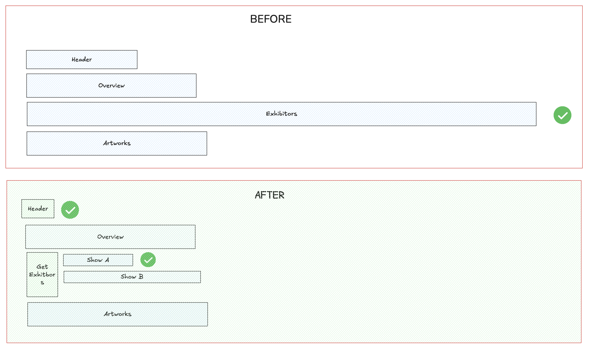 Example: To render the exhibitors tab, we don’t need just one query. In our case, because getting the artwork for each exhibitor was taking a long time, we had multiple queries, one to get the exhibitor metadata, and another query to get the artworks, that is lazily loaded when the exhibitor rail is close to the viewport
